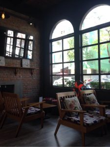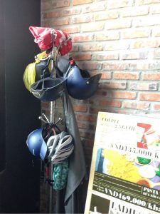 カフェには従業員の人達のヘルメットがいっぱいでした。